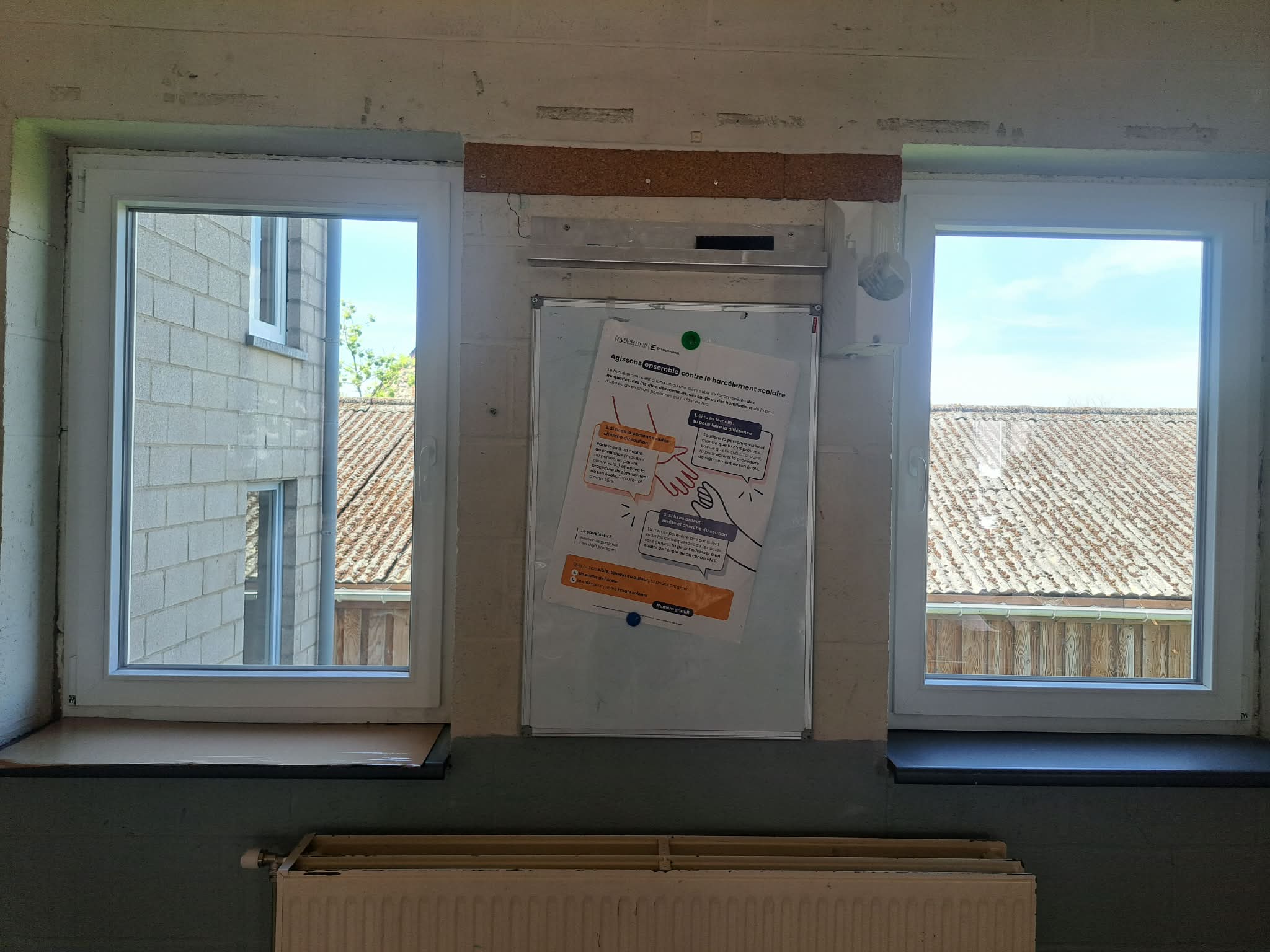 De nouveaux châssis ont été installés dans plusieurs locaux : le réfectoire, la classe des maternelles, la grande salle, le local de ping-pong ainsi que l’accueil extrascolaire.